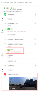 동일조건으로 검색시 아래 화살표를 누르면 위와 같이 버스번호와 도보까지도 확인할 수 있습니다. 경로가 대개 1~5군데 나와있지만 저는 개인적으로 1번 경로에서 자주 이용하고 있습니다. 이유는 최소시간 순으로 나열되기 때문입니다.
