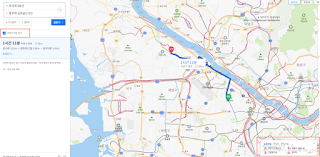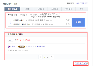 출발지와 도착지를 입력한 후 옆 길 안내 버튼을 클릭하면 대중교통 추천 경로를 확인할 수 있습니다 경로에 따른 시간 및 대중교통 이용요금과 총 키로 수도 표시됩니다.